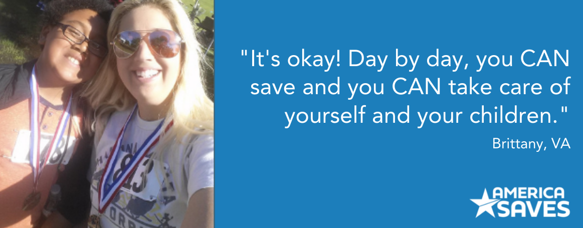 According to Brittany, “You work out a financial plan with a significant other, you get married and/or have children, you live together and pay bills. However, for one reason or another, life throws you a curve ball and changes the whole scenario. It is so important for a single person, especially a single parent, to have control over their own finances. We have to learn to use what we currently have, and make our paycheck last, to ensure our children and ourselves, are healthy and in a good place. America Saves emails have served as that voice, whispering to me, "It's okay! Day by day, you CAN save and you CAN take care of yourself and your children.”